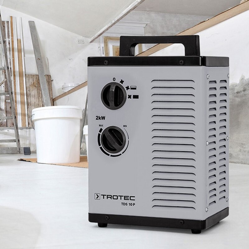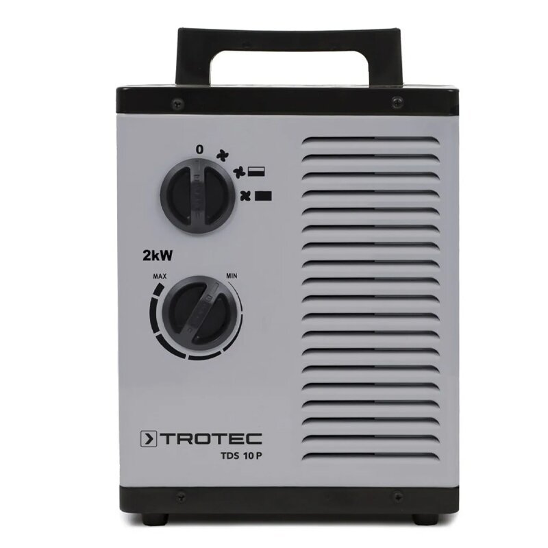 TDS 10 P elektrinis šildytuvas – tai tvirtas elektrinis šildymo įrenginys su metaline konstrukcija ir galingu, bet tyliu radialiniu ventiliatoriumi, skirtas greitam ir efektyviam patalpų šildymui. Dėka integruotos apsaugos nuo perkaitimo bei papildomos apsaugos nuo pasvirimo, automatiškai išjungiančios prietaisą, kai šis atsitiktinai pakreipiamas, šis šildytuvas gali būti saugiai naudojamas rūsiuose, sandėliavimo patalpose, nešildomose patalpose vykstant statybų darbams, statybų gyvenamosiose priekabose ar ant stogo dangos. TDS 10 P, kaip kiti elektriniai šildytuvai, šildymo metu neišskiria kondensato ir nedegina deguonies, todėl šis prietaisas puikiai tinka uždaroms, neventiliuojamoms patalpoms šildyti. Prietaise įmontuotas termostatas, galima pasirinkti du šildymo lygius iki 2 kW. Keramikinis šildymo elementas užtikrina ilgesnį tarnavimo ir trumpesnį šildymo laiką, tinkamumą alergiškiems žmonėms dėl šildymo metu nedeginamų dulkių.