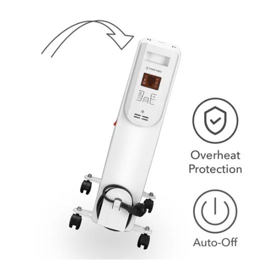 Protingas ir energiją taupantis TRH 26 E tepalinis radiatorius užtikrina kambario temperatūrą nuo 15°C iki 35°C. Lengvai ir patogiai nustatykite norimą tikslinę temperatūrą naudodami skaitmeninį termostatą, kurį rasite įrenginyje arba naudodami nuotolinio valdymo pultą. Pasiekus norimą temperatūrą, šildytuvas išsijungia. Jei patalpos temperatūra nukrenta žemiau iš anksto nustatyto temperatūros, radiatorius vėl įsijungia, kad vėl įkaistų. Tai ne tik patogu, bet ir sutaupo daug energijos!