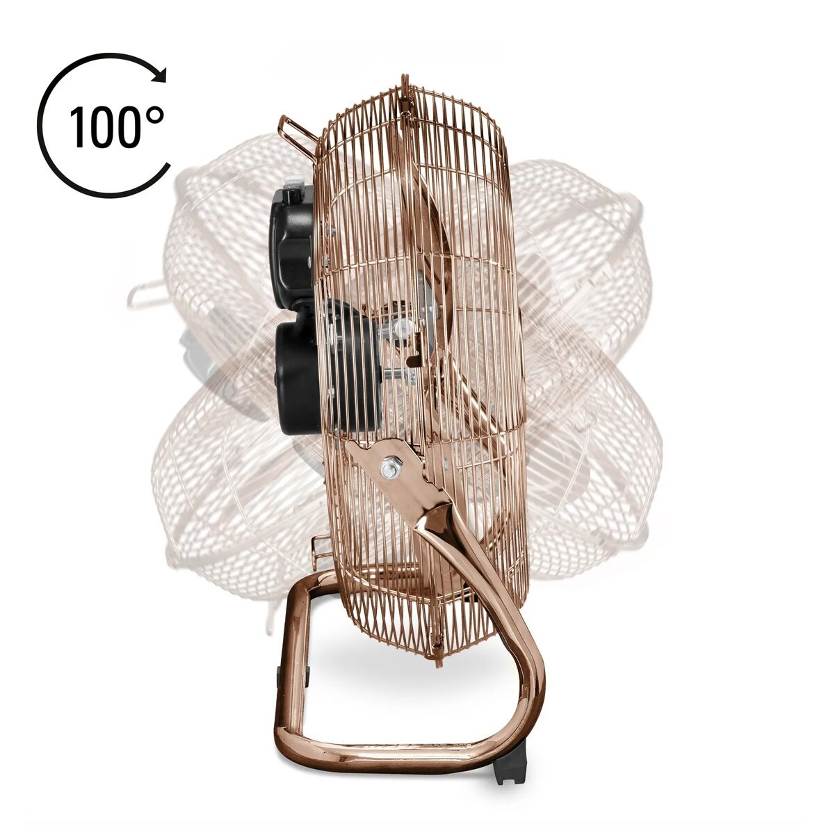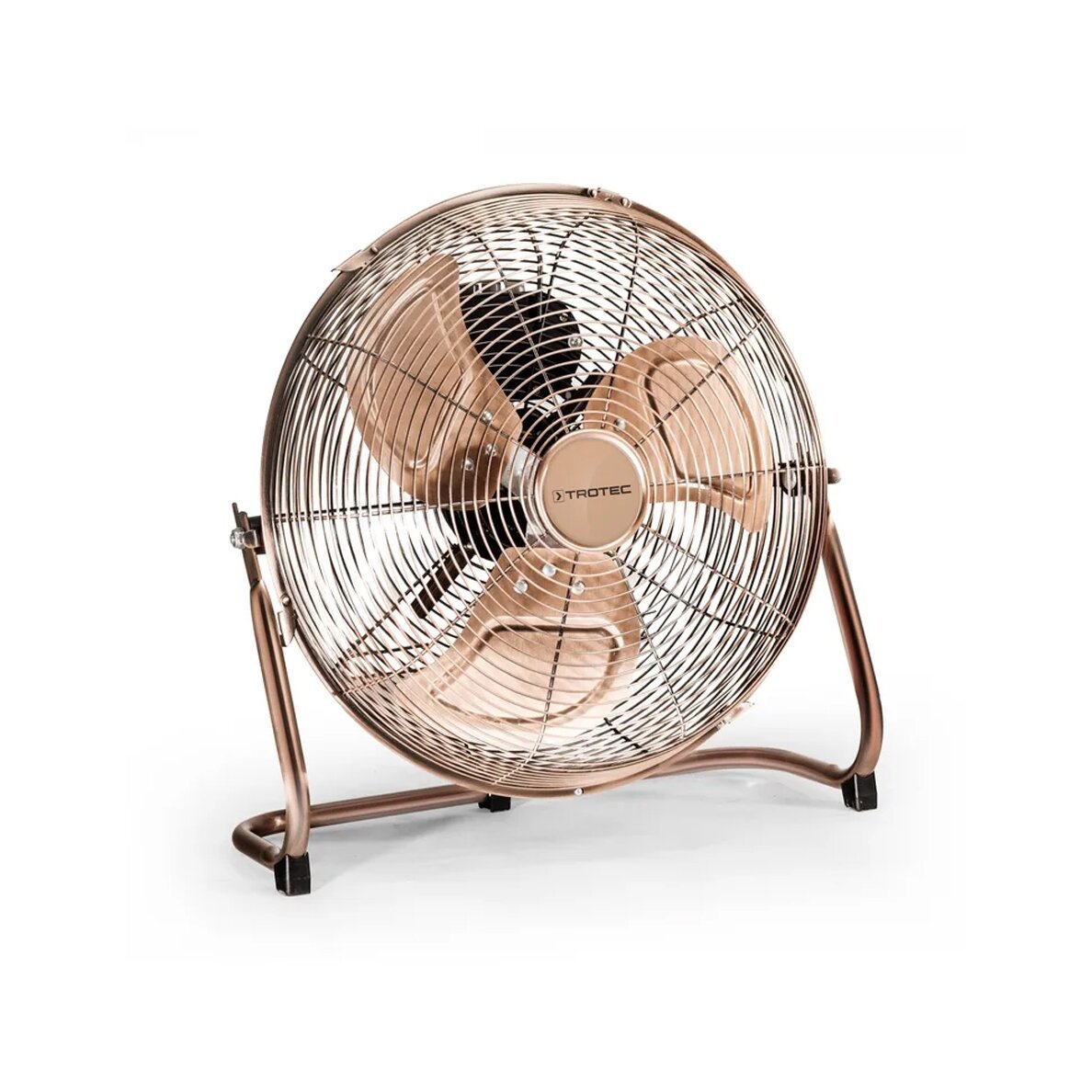 Grindinis ventiliatorius Trotec TVM 13 leis mėgautis malonia vėsa namuose, ofise ar bet kurioje reikiamoje vietoje! Stilingo dizaino ventiliatorius pagamintas tik iš metalo ir daugiausia padengtas variu – net variklis turi varinę ritę. Jis ne tik atrodo blizgantis, bet ir dėl tvirtos konstrukcijos yra skirtas labai ilgam tarnavimo laikui. Tylaus veikimo (vos 59 dB 1 metro atstumu) ir 44 W variklio galios grindinis ventiliatorius Trotec TVM 13 tyliai ir kas svarbiausia greitai atvėsins patalpą, o reguliuojamas 100° pasvirimo kampas vėsins tik ten, kur labiausiai to reikia. Ventiliatorius turi tris greičio lygius, o stipriausiu pajėgumu yra pasiekiamas 3,38 m³/h oro srauto greitis. Vėjelio lygius galima reguliuoti įrenginio nugarinėje pusėje. Taip pat, kartu su papildomais tvirtinimais, kurie į komplektaciją neįeina, ventiliatorių galima montuoti tiek prie sienų, tiek prie lubų, o tai leis mėgautis malonia vėsa restoranų, kavinių ir kt. paskirties erdvėse.