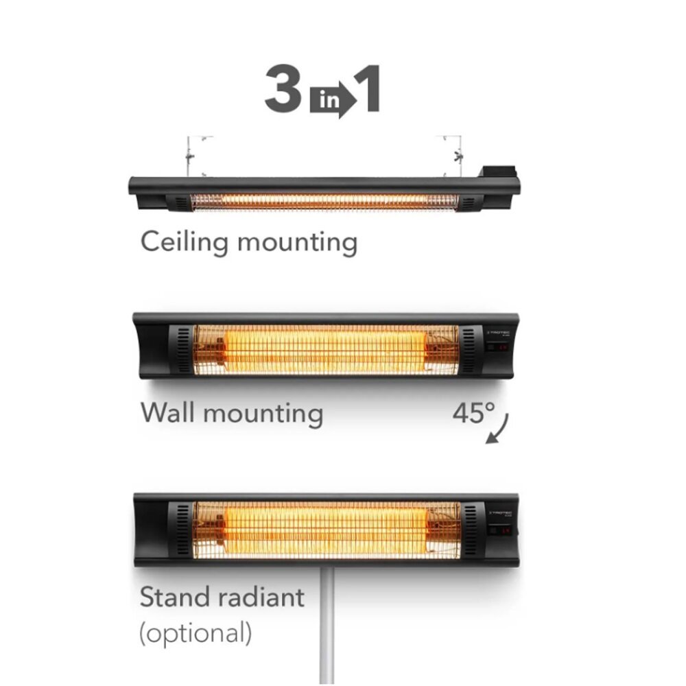 Halogeninis infraraudonųjų spindulių šildytuvas Trotec IR 2005 – tai „3 in1“ sieninis, lubų ir grindų infraraudonųjų spindulių šildytuvas intensyviam momentiniam (maks. 2000 W) lauko šildymui – su nuotolinio valdymo pulteliu ir keturiais šildymo lygiais.
