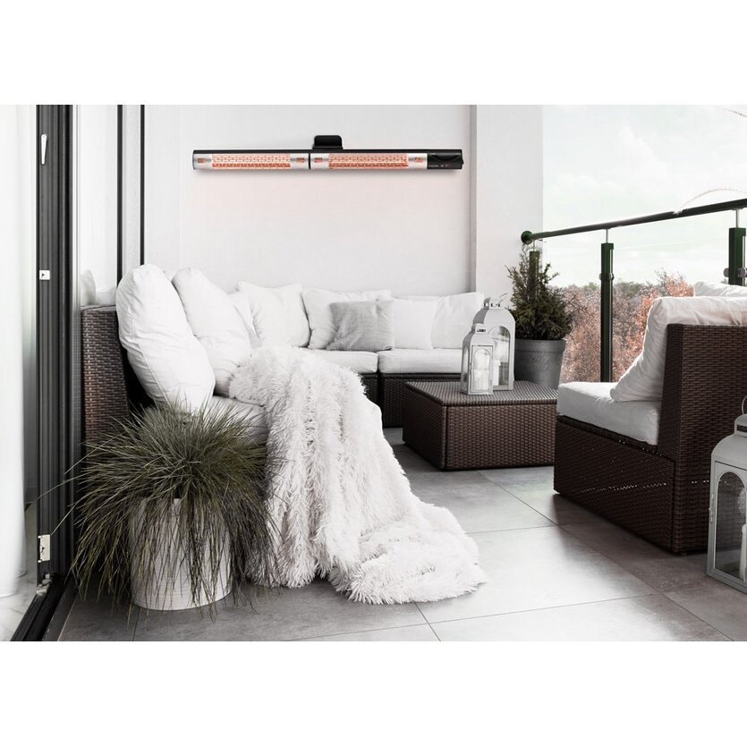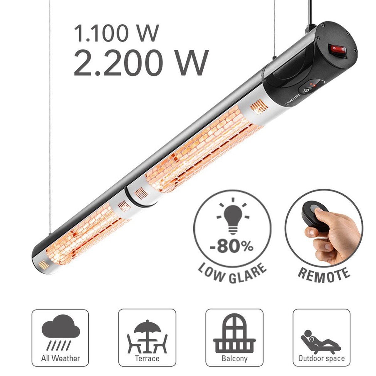 Halogeninis infraraudonųjų spindulių šildytuvas Trotec IR 2200 – modernus, industrinės išvaizdos halogeninis infraraudonųjų spindulių šildytuvas su dvejais šildymo lygiais, nuotolinio valdymo pulteliu bei skleidžiamą šviesą mažinančia mažo akinimo technologija. Šildytuvą galima tvirtinti prie lubų arba sienos horizontaliai ir vertikaliai. Aliuminio korpusas, pagamintas pagal apsaugos klasę IP66, patikimai apsaugo įrenginį nuo dulkių, purvo ir vandens purslų iš visų pusių. 2200 vatų infraraudonųjų spindulių šildytuvas Trotec IR 2200 rekomenduojamas maždaug 9m²–15m² lauko patalpų plotams. Dviejų kaitinimo elementų šildymo intensyvumą galima reguliuoti pagal poreikį: pirmoje šildymo pakopoje įsijungia vienas, antroje pakopoje du šildymo elementai. Priešingai nuo kitų lauko šildytuvų, IR 2200 pirmiausia šildo odą ir kitus paviršius, o ne aplinkos orą. Dėl šio veikimo principo jis šildo pastebimai intensyviau ir efektyviau nei kitos šildymo technologijos nesukeldamas nemalonių kvapų ar triukšmo.