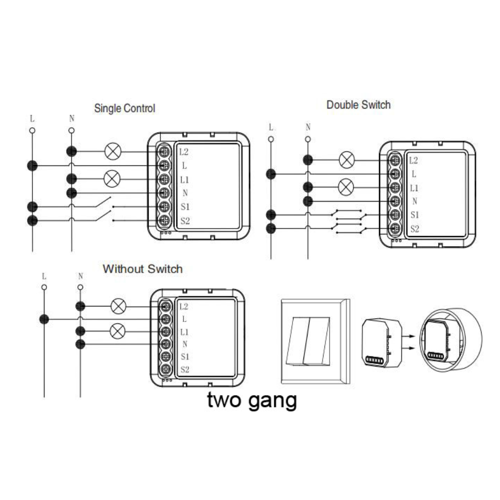Modulis montuojamas tiesiai į potinkinę dėžutę, už tradicinio jungiklio. Prijungiami L, N, IN ir OUT laidai (pagal schemą). Neutralus laidas yra būtinas. Modulis neturi fizinio mygtuko – jis įjungia/išjungia srovę pagal jungiklio padėtį arba išmanų valdymą.