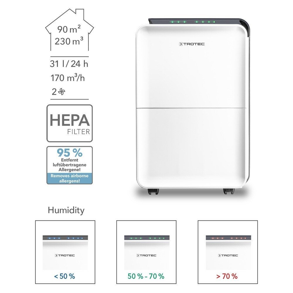 Itin efektyvus sprendimas patalpos klimato gerinimui: sumažinamas drėgmės kiekis iki 31 litro per dieną ir 95 % užtikrinamas oro valymas HEPA filtru, apsaugančiu nuo pelėsių, bakterijų, virusų, dulkių, žiedadulkių ir alergenų.