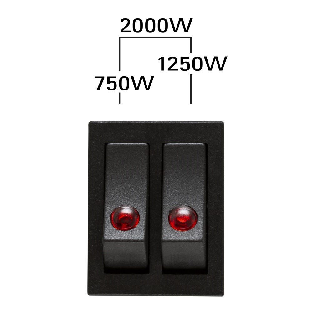 - Šildymo galia (Lygiai 1 / 2 / 3): 750 W / 1.250 W / 2.000 W;