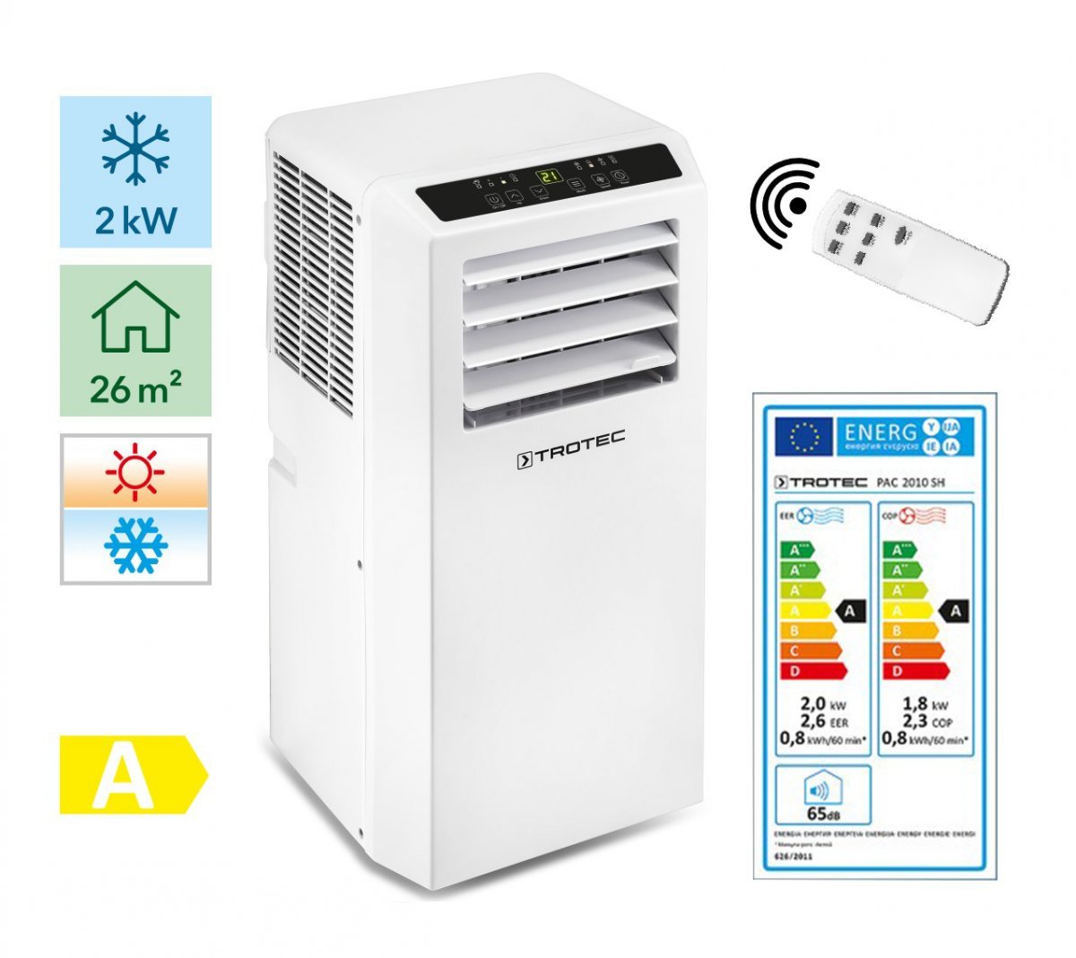 Naudodami kombinuotą oro kondicionierių ir šildytuvą Trotec PAC 2010 SH, galėsite visus metus mėgautis komfortiška kambario temperatūra! Mobilus oro kondicionierius Trotec PAC 2010 SH greitai ir efektyviai vėsina karštomis vasaros dienomis, naudodamas 2 kW elektros energijos bei šildo patalpos orą esant vėsiems rudens vakarams, naudodamas 1,8 kW elektros energijos. Mobilus oro kondicionierius Trotec PAC 2010 SH puikiai atliks savo funkcijas namuose, biuruose, verslo patalpose, sodo nameliuose, viešbutyje ar restorane, kurių plotas yra iki 26 m², 65 m³ tūrio. Ypač efektyviam energijos taupymui kompresorius automatiškai išsijungia tiek šildymo, tiek aušinimo metu, kai pasiekiama norima temperatūra.