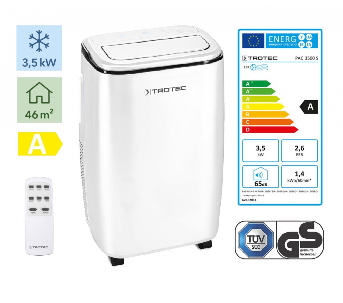Stilingas mobilus oro kondicionierius Trotec PAC 3500 S leis mėgautis komfortiška kambario temperatūra ištisus metus. Oro kondicionierius Trotec PAC 3500 S greitai ir efektyviai vėsina karštomis vasaros dienomis, todėl galėsite mėgautis atvėsinta 16-31°C kambario temperatūra sunaudodami tik 3,5 kW elektros energijos. Šis oro kondicionierius puikiai atliks savo funkcijas namuose, biuruose, verslo patalpose, sodo nameliuose, viešbutyje, restorane, dirbtuvėse, galerijose, gydytojų kabinetuose, kurių plotas yra iki 46 m² arba 115 m³. Siekdami sumažinti patiriamas elektros energijos sąnaudas, įrenginys užtikrina ekonomišką veikimą – išjungiama vėsinimo funkcija automatiškai pasiekus iš anksto nustatytą temperatūrą. Tai reiškia, kad įrenginys vėsins tik tada, kai bus viršyta norima temperatūros vertė.