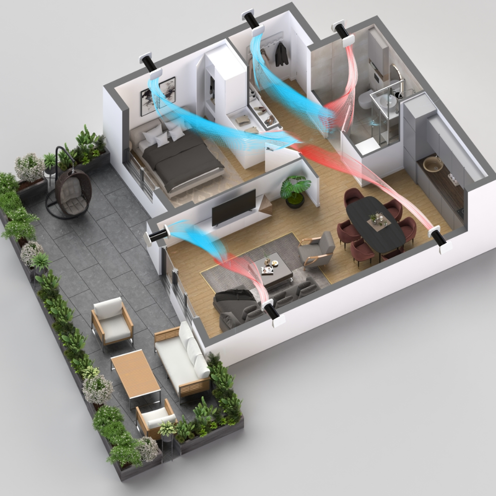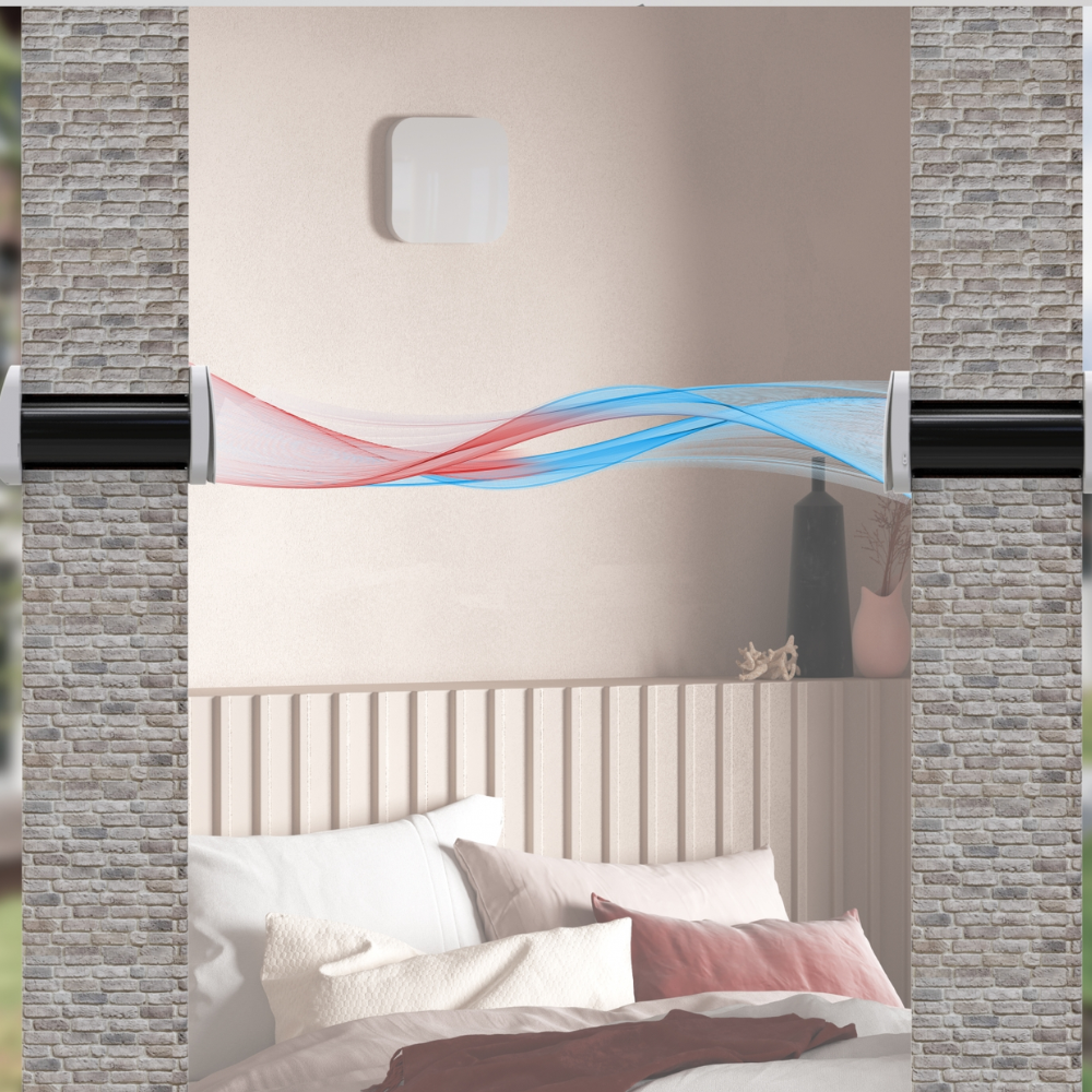 Mini rekuperatorius BSK Zephyr Mini gali būti susietas su kitais tos pačios serijos įrenginiais, kad veiktų kaip išmani zoninė ventiliacijos sistema. Vienas įrenginys gali tapti „pagrindiniu“, o kiti veiks sinchroniškai: kai vienas įrenginys įtraukia orą, kiti automatiškai pereina į ištraukimo režimą. Tokia schema leidžia efektyviai cirkuliuoti orui tarp patalpų ir sukurti nuolatinį, subalansuotą vėdinimą visame būste – be centralizuotos sistemos.